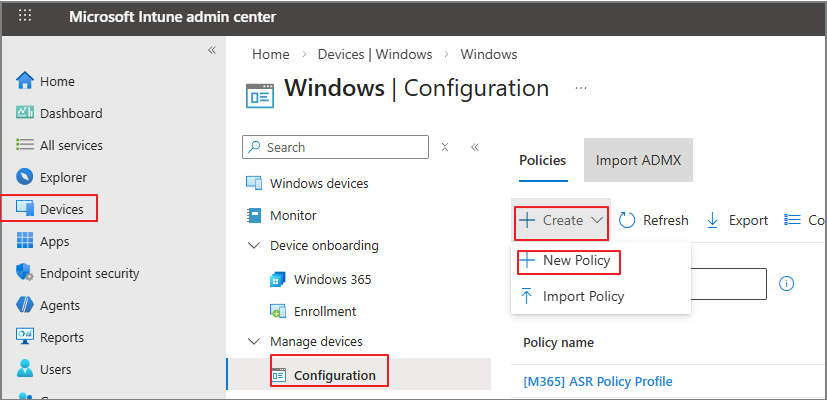 Intune Admin Center > Devices > Windows > Manage Devices > Configuration > Create > New Policy