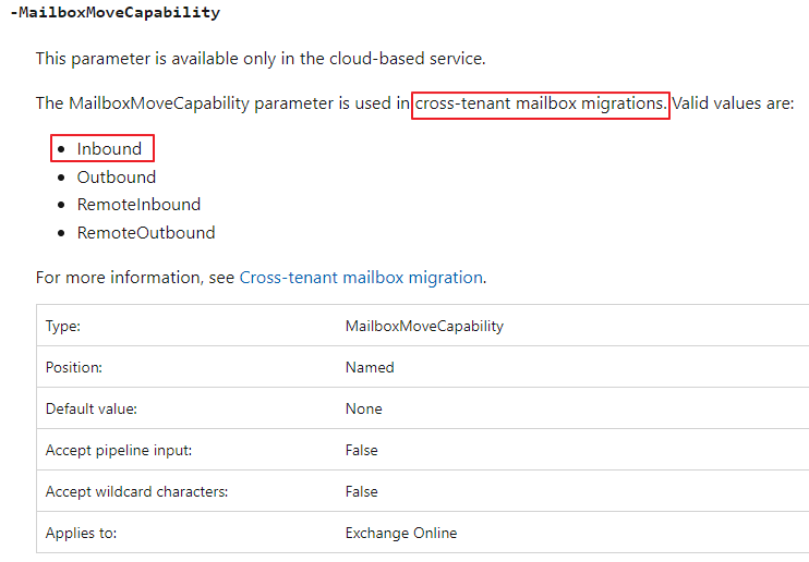 MailboxMoveCapability is understood as specifying the direction of Cross-Tenant Mailbox Migration.
