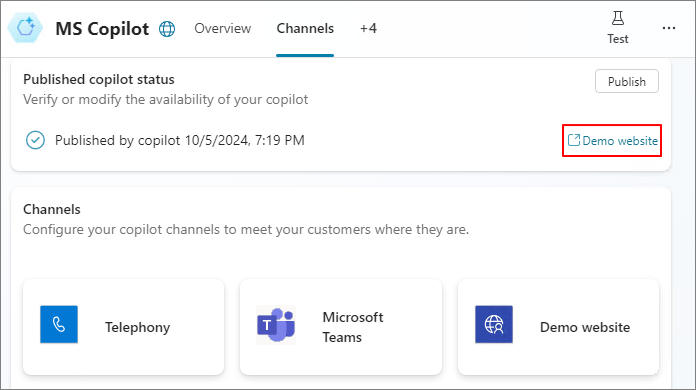 Click Channels -> Demo website to verify if the deployed Copilot is functioning correctly on the web.