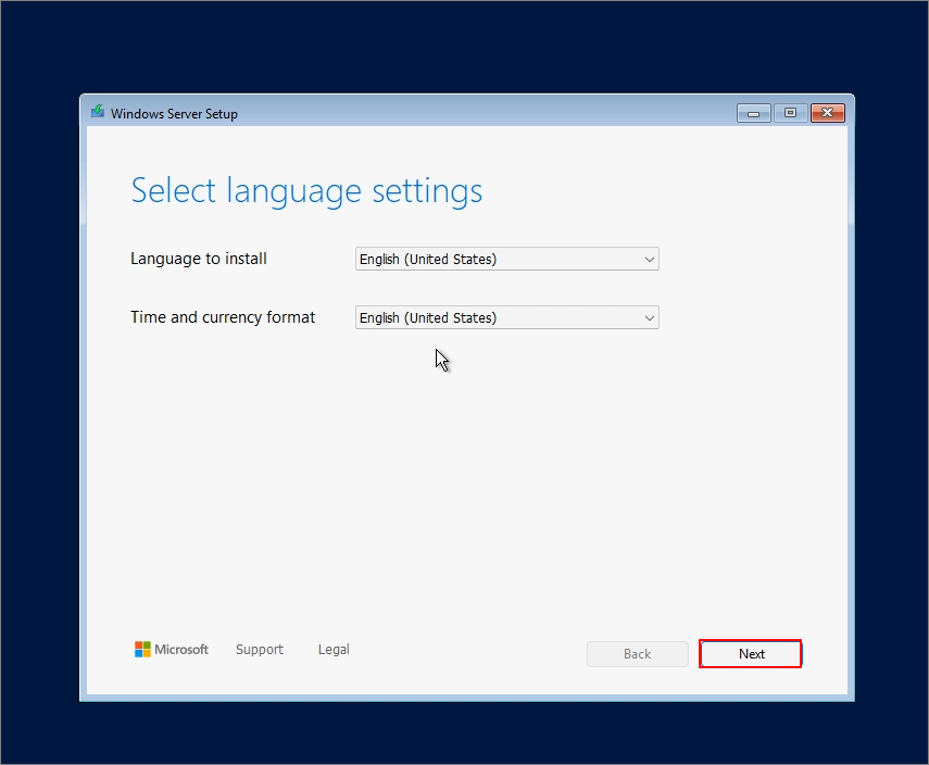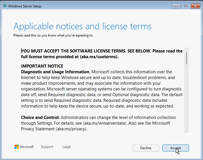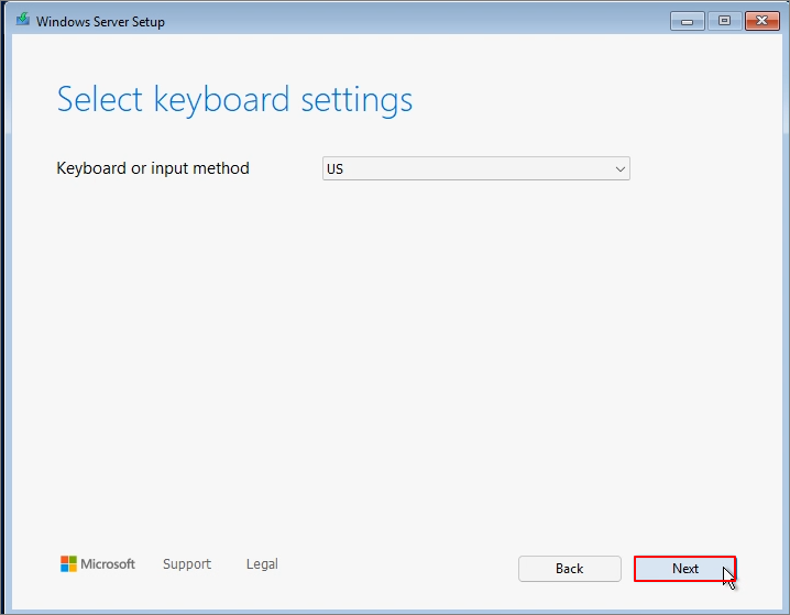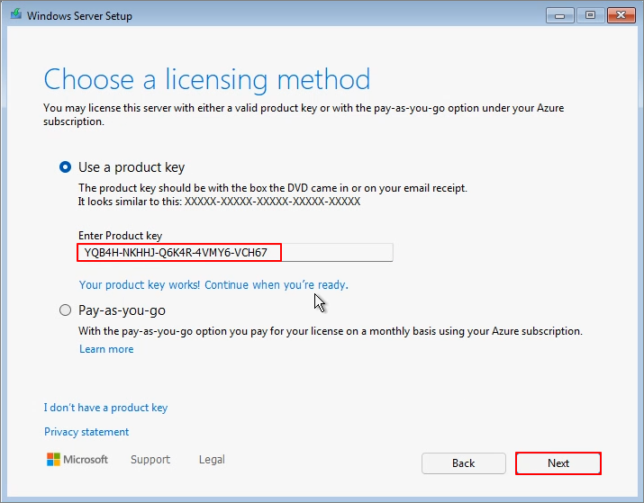 Enter Product Key -> Next (I entered an AVMA key as I am using it in a Hyper-V environment.)