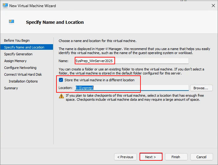 Name specification -> Set Default Location -> Next
