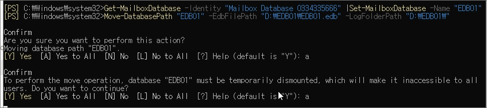 Move-DatabasePath "New DB name" -EdbFilePath "D:\EDB01\EDB01.edb" -LogFolderPath "D:\EDB01\"