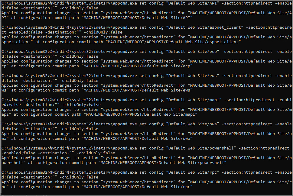 %windir%\system32\inetsrv\appcmd.exe set config "Default Web Site/ecp" -section:httpredirect -enabled:false -destination:"" -childOnly:false