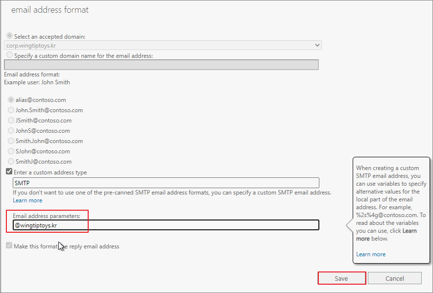 Go to Email address format -> Make the necessary modifications.