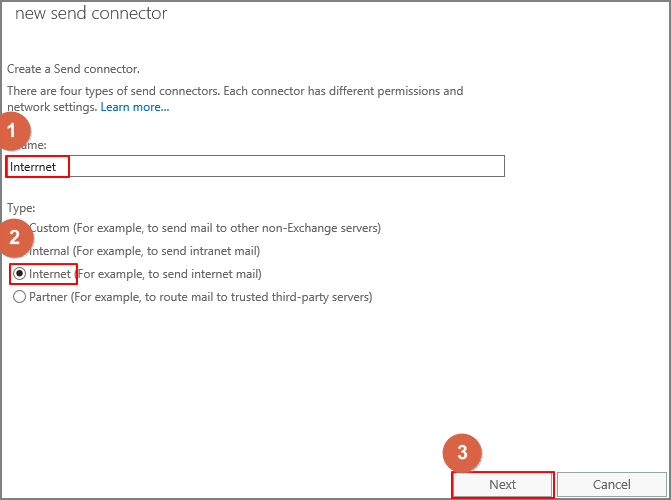 Specify the Connector Name -> Select Type: Internet -> Click Next.