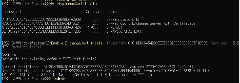 Enable-ExchangeCertificate -Thumbprint <Thumbprint> -Services IIS,SMTP -DoNotRequireSsl