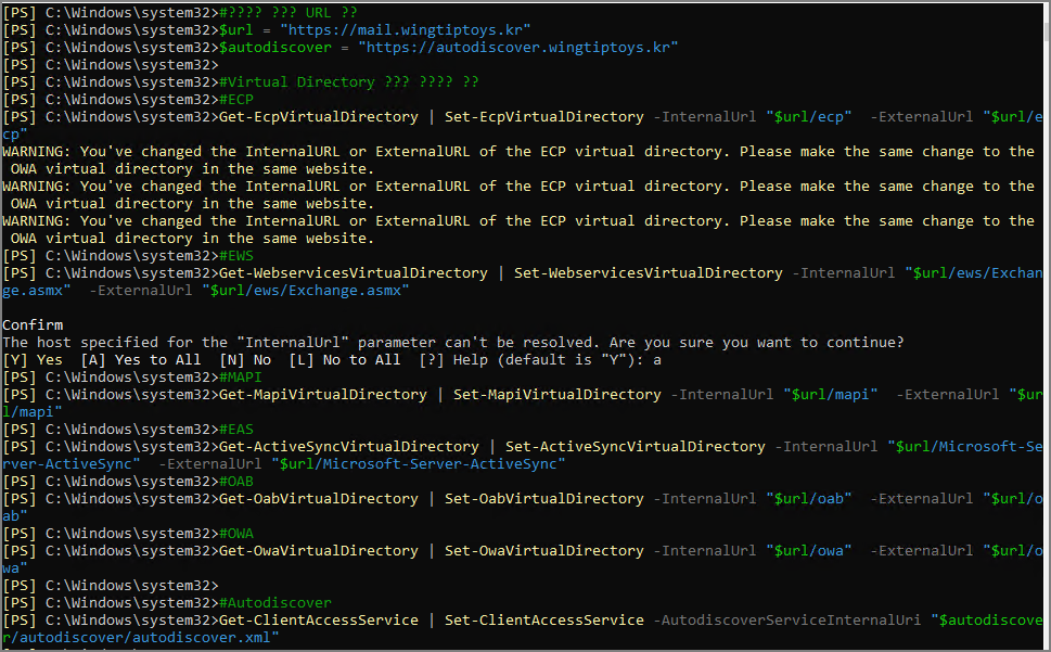 Get-OwaVirtualDirectory | Set-OwaVirtualDirectory -InternalUrl "$url/owa" -ExternalUrl "$url/owa"