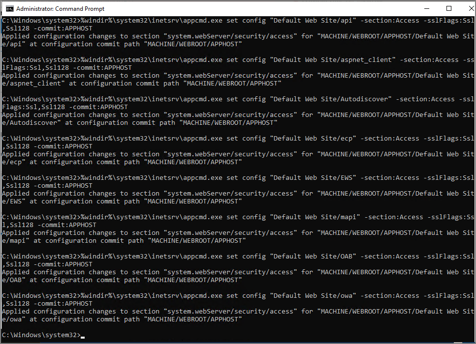 %windir%\system32\inetsrv\appcmd.exe set config "Default Web Site/ecp" -section:Access -sslFlags:Ssl,Ssl128 -commit:APPHOST