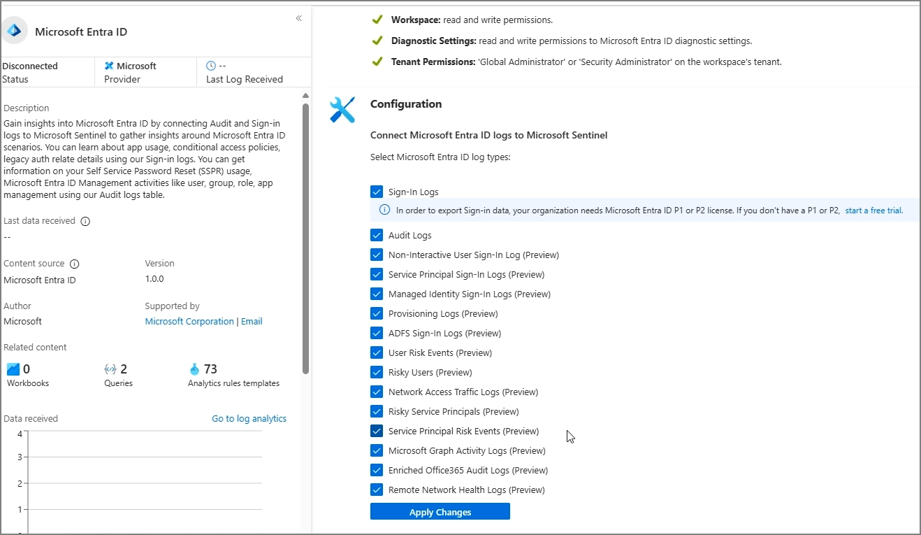 Data Connectors → Microsoft Entra ID → Open connector page