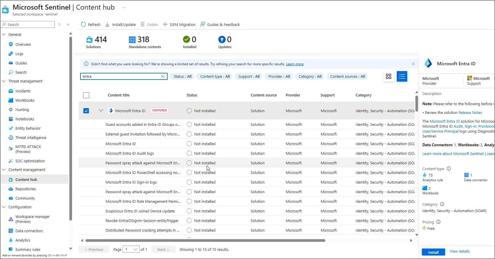 If you refresh in the Content hub within Sentinel on Azure, you will see the available Content that can be added as shown below.
