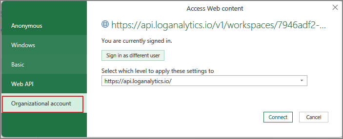 - Authenticate using Organizational account, then Close & Load to load it into a worksheet table.