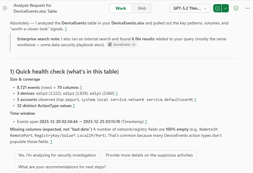 …then Excel can be the more efficient tool. And once the dataset is in OneDrive/SharePoint, Copilot becomes an extra boost for rapid investigation.