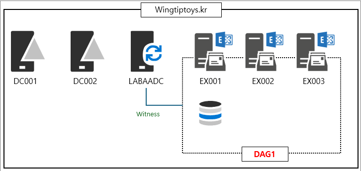 The environment and specifications remain the same as in the previous post, with three Exchange Servers making up the DAG. The final architecture is as follows: