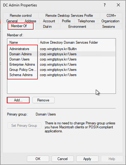 Assign the Enterprise Admins and Schema Admins permissions to the service account.