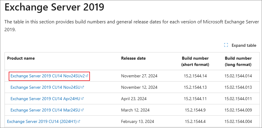 Download the latest Cumulative Update (CU) for Exchange Server 2019 from the Build Number page linked below.