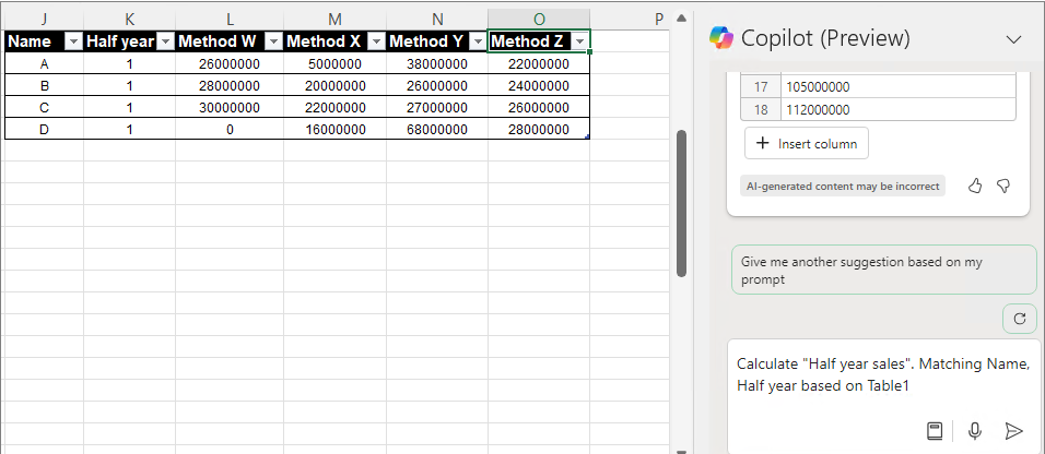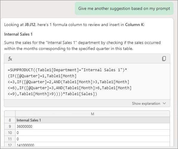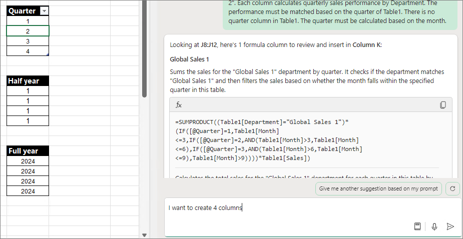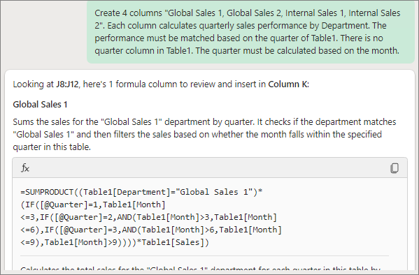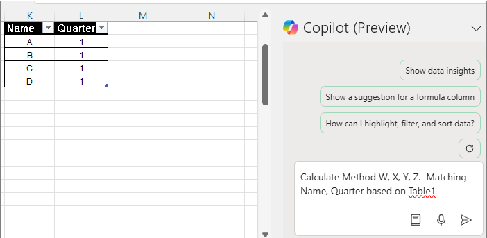 It seems that calculating the quarter isn't working well. Pre-inserting the quarter into Table1 lowers the difficulty. Therefore, the structure of the Source Table is crucial when using Copilot.