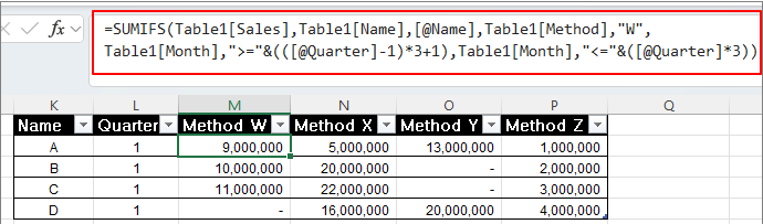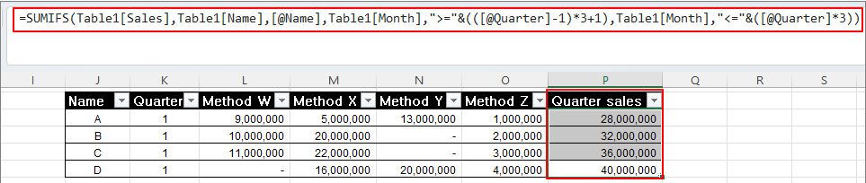 Calculate Method W, X, Y, Z. Matching Name, Quarter based on Table1