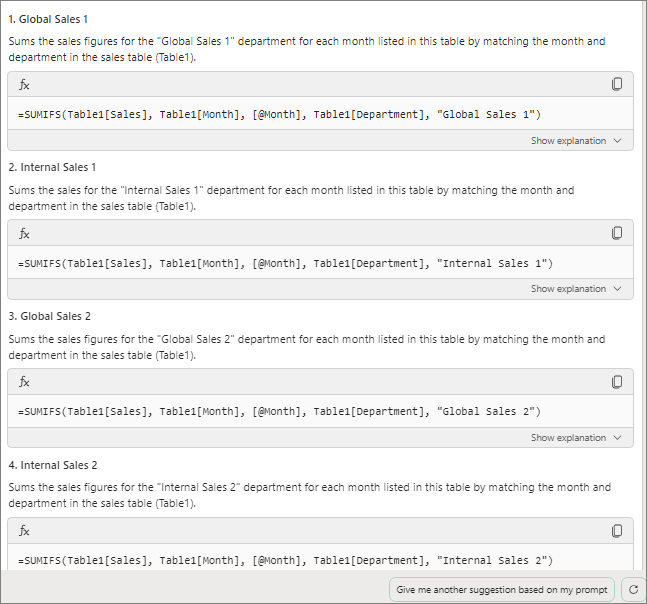 Create columns "Department: Global Sales 1, Global Sales 2, Internal Sales 1, Internal Sales 2". Calculate Sales Performance, Matching Month based on Table1.