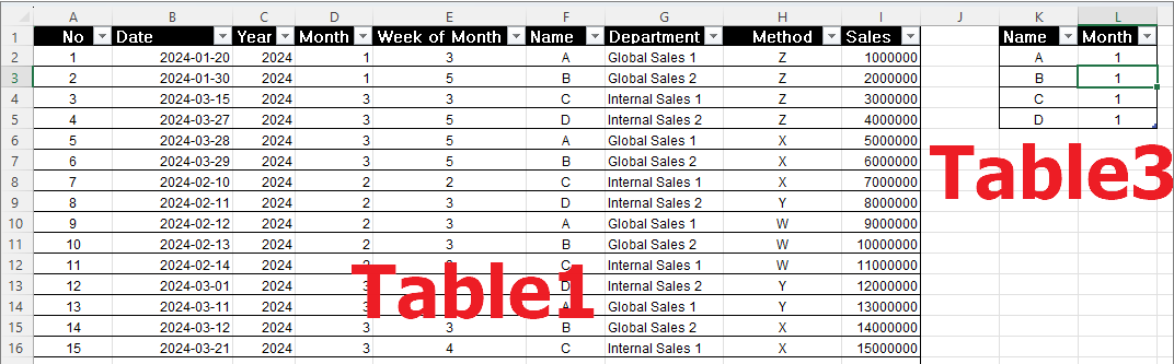Create columns "Method: W, X, Y, Z". Calculate Sales Performance, Matching Month based on Table1.
