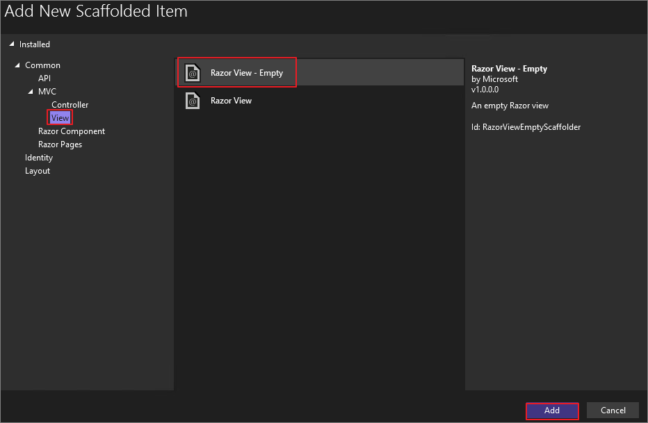 Razor View -> Empty -> Add