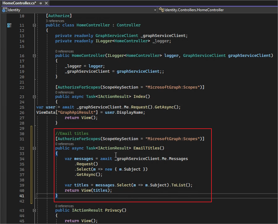 public HomeController(ILogger<HomeController> logger, GraphServiceClient graphServiceClient)