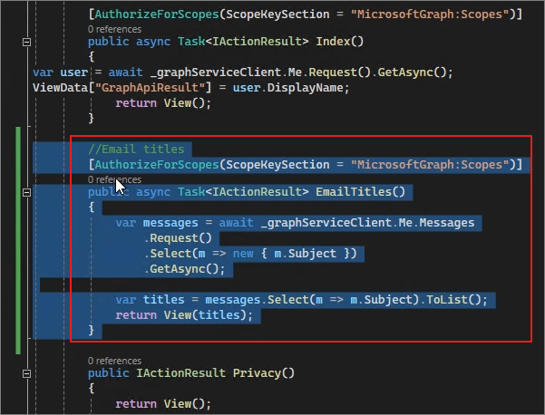[AuthorizeForScopes(ScopeKeySection = "MicrosoftGraph:Scopes")]