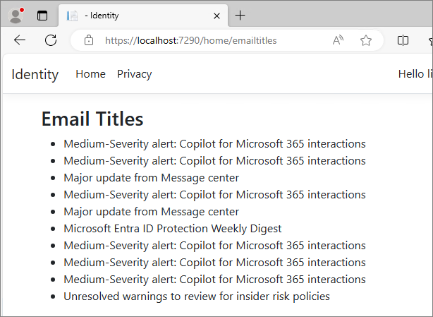 We will test the Mail.Read permission by retrieving only the subject lines of the user's emails on a specific page.