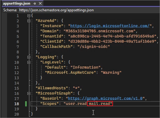 Add the Mail.Read permission to the existing Appsettings.json -> Save the file.