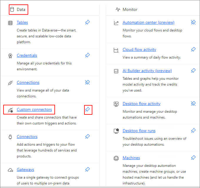 In the Data section, click on Custom connectors or click the Pin icon to pin it for easy access.