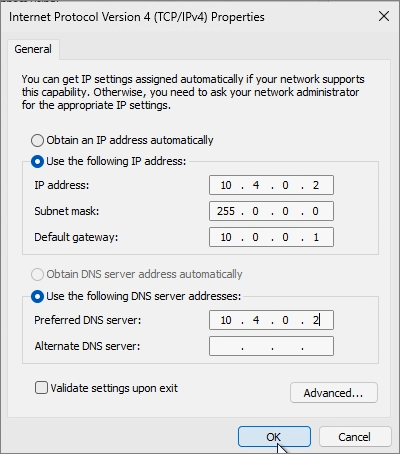 Enter the IP address according to your environment. Set the DNS to point to the IP address of the Domain Controller itself.