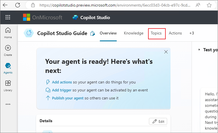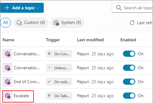 Navigate to the Topics menu in the Agent where the email flow will be linked.