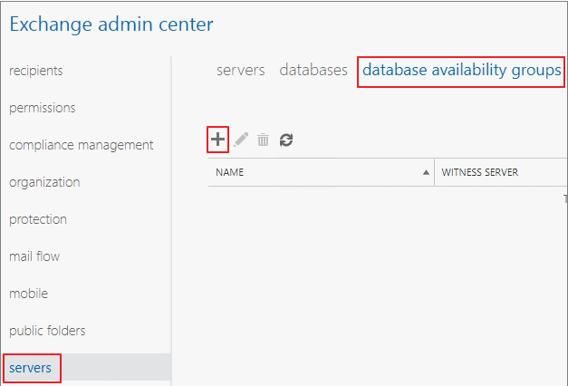 Open Exchange Admin Center (ECP) -> Servers -> Database Availability Groups -> Add