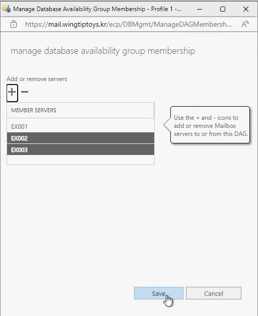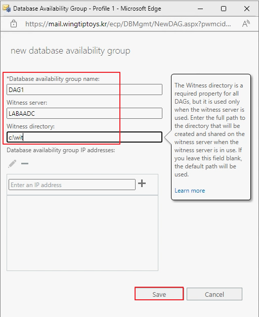 Specify the DAG name -> Enter Witness Server details -> Click Save