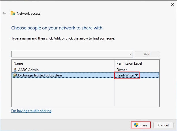- The Exchange Trusted Subsystem group must have Read/Write permissions on the folder.