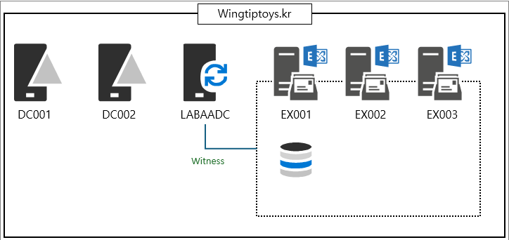 The environment and specifications remain the same as in the previous post, with three Exchange Servers making up the DAG. The final architecture is as follows: