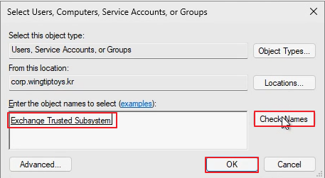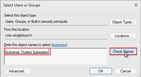 Enter Exchange Trusted Subsystem -> Check Names -> OK