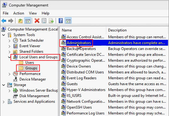 Go to Local Users and Groups -> Groups -> Administrators