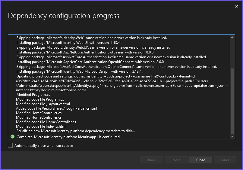 Service is registered, and verify that Secrets.json (Local) has been created.