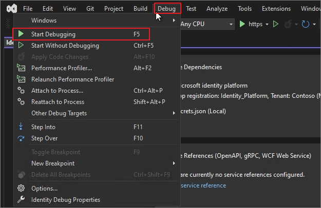 Start Debuging -> Log in -> Verify permissions and click Accept.