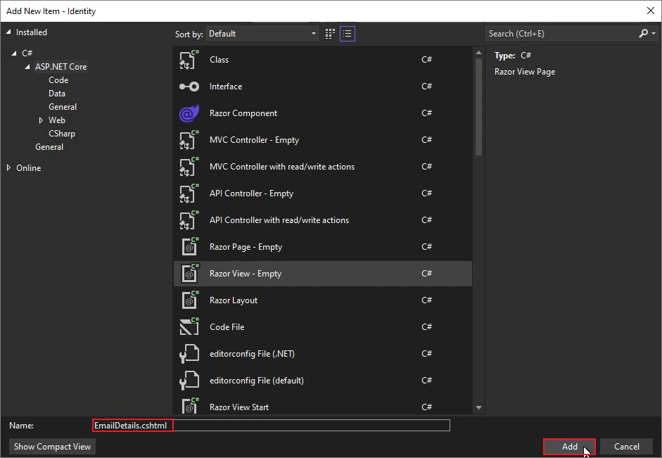 Razor View - Empty -> Confirm the name as Index.cshtml. -> Add