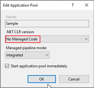 .NET CLR version -> Change the setting to **No Managed Code**.