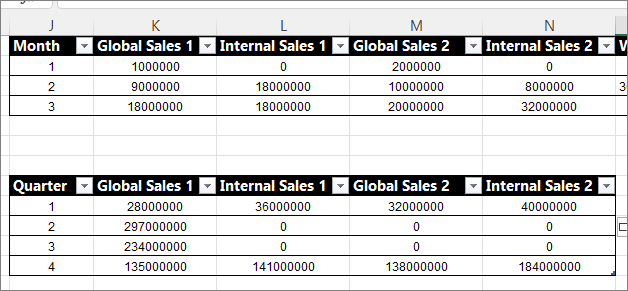 Create 4 columns "Global Sales 1, Global Sales 2, Internal Sales 1, Internal Sales 2".