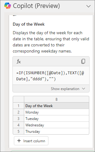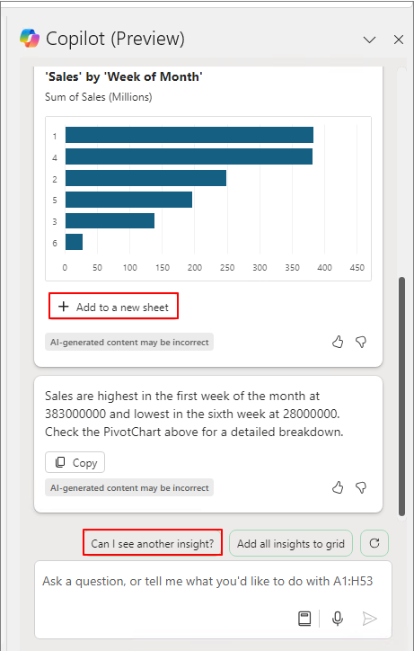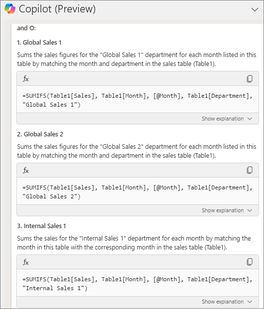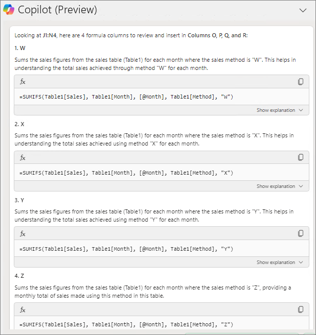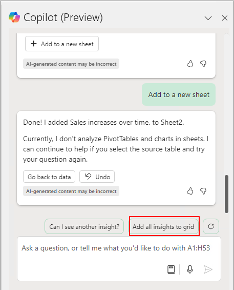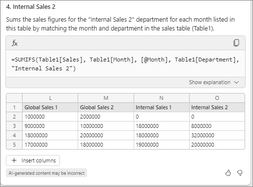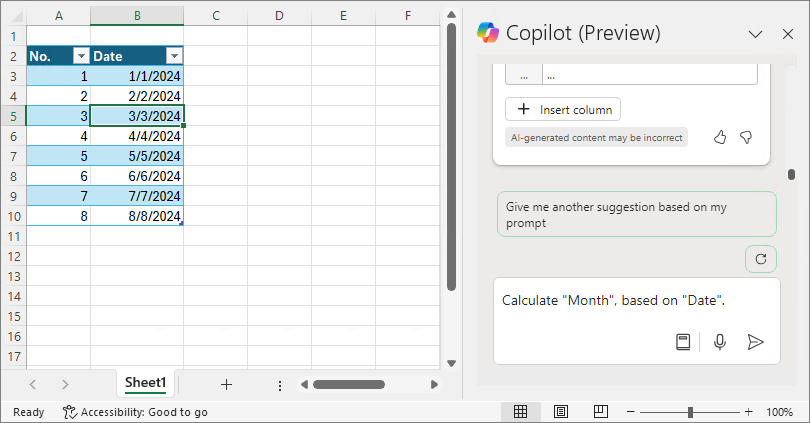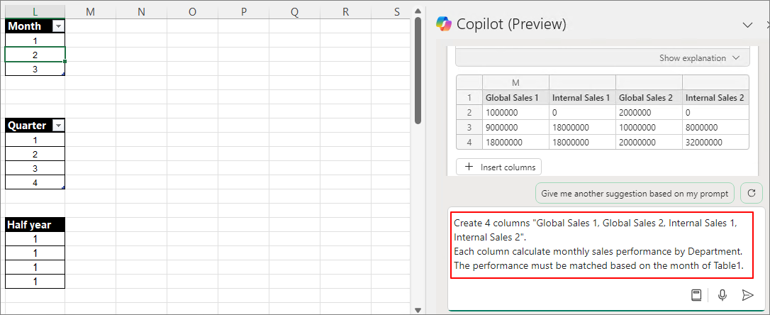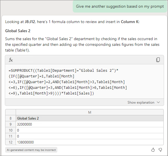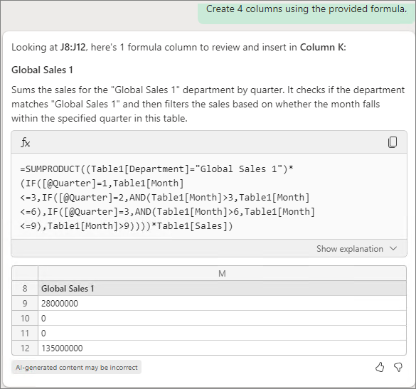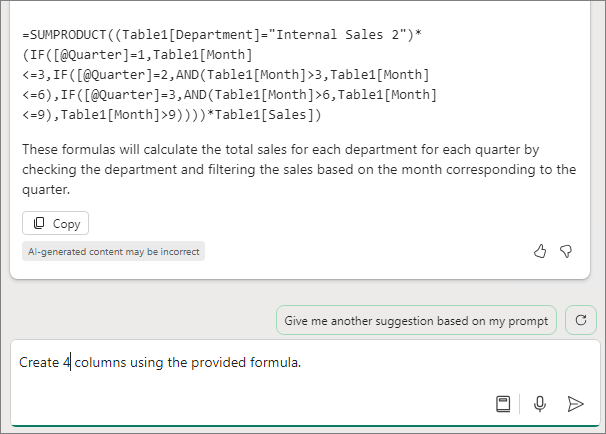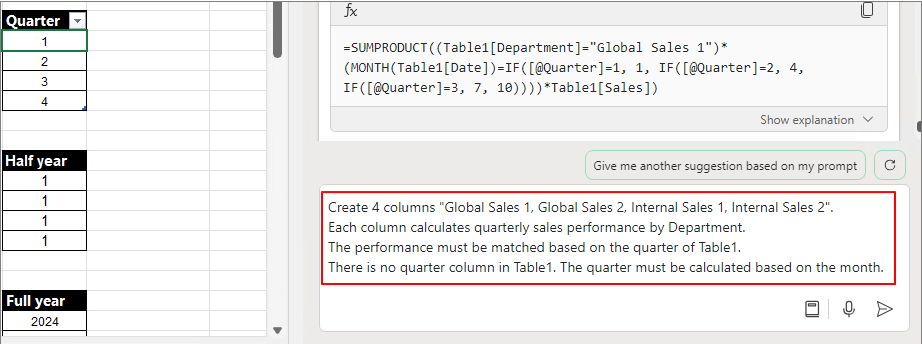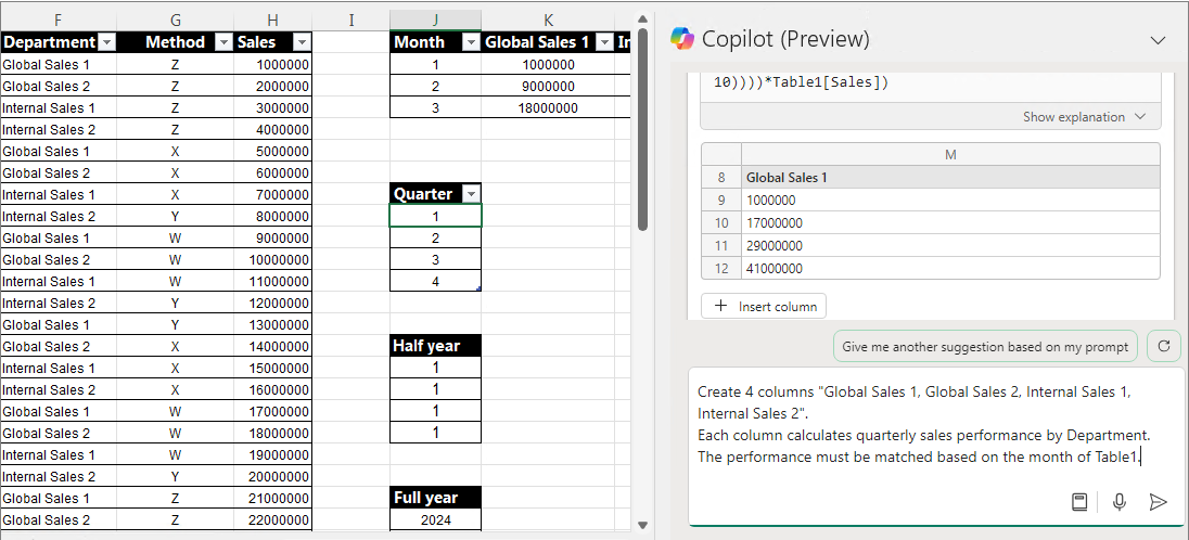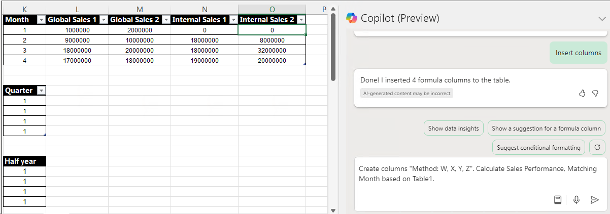 It seems that calculating the quarter isn't working well. Pre-inserting the quarter into Table1 lowers the difficulty. Therefore, the structure of the Source Table is crucial when using Copilot.