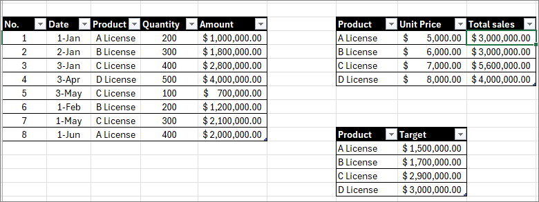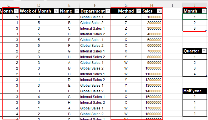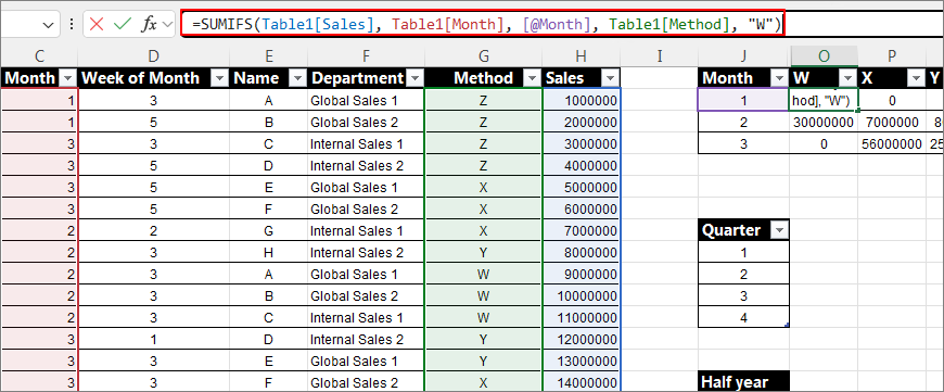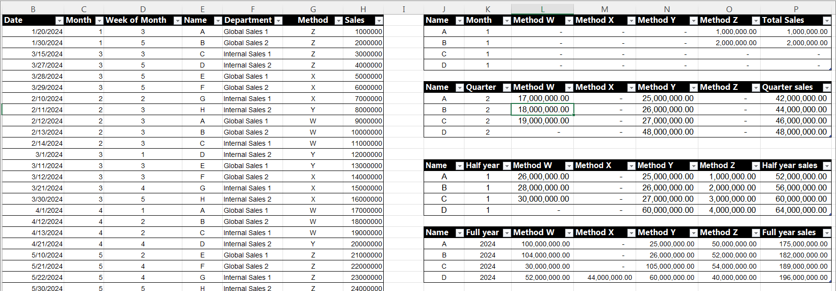 Create columns "Method: W, X, Y, Z". Calculate Sales Performance, Matching Month based on Table1.