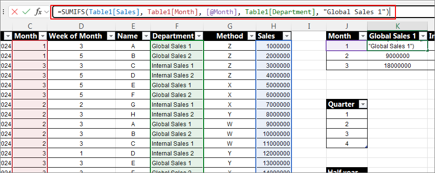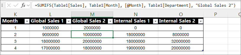 Create columns "Department: Global Sales 1, Global Sales 2, Internal Sales 1, Internal Sales 2". Calculate Sales Performance, Matching Month based on Table1.
