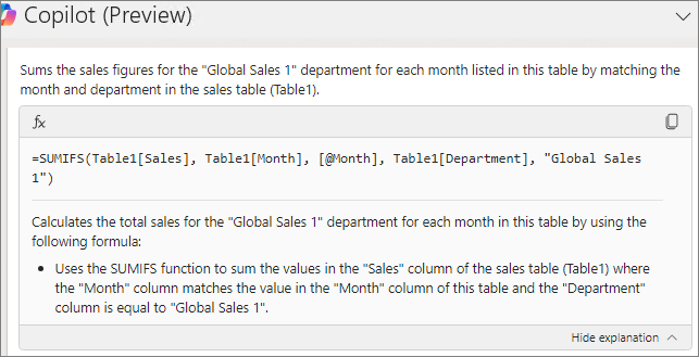Clicking "Hide explanation" allows you to check the explanation of the formula.
