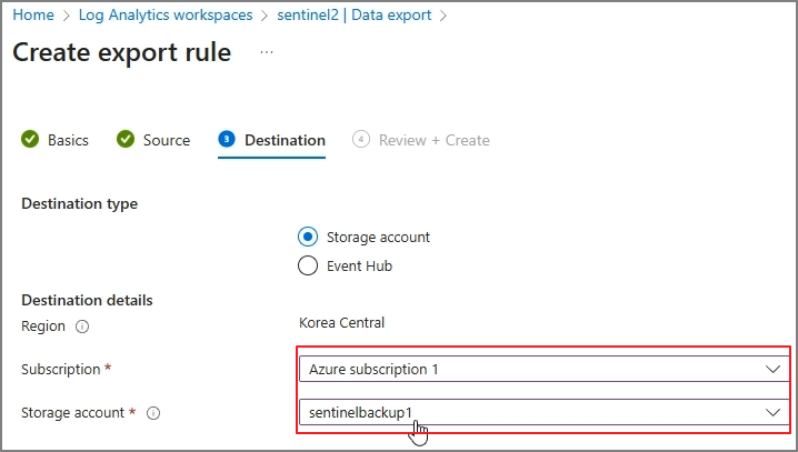 1. Go to Log Analytics Workspace → Settings → Data Export → Create export rule