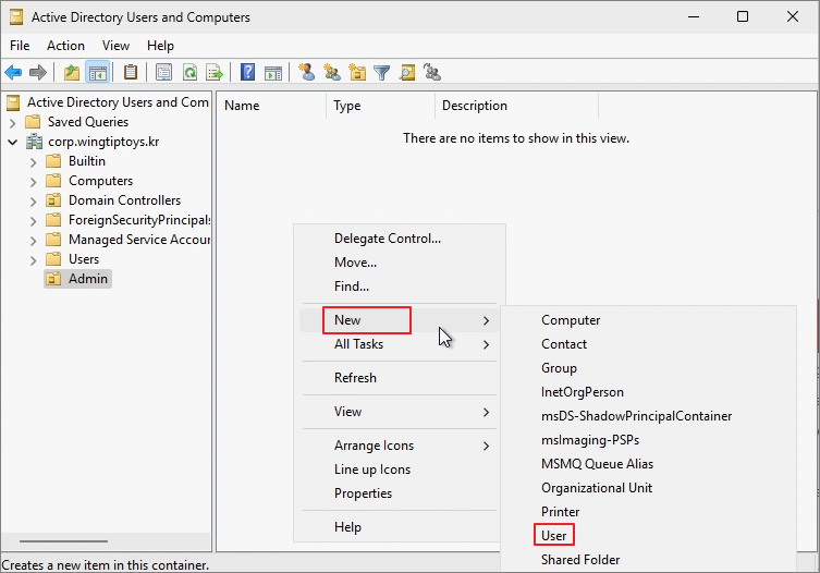 Right-click on the Domain -> Select New -> Choose Organizational Unit (OU).