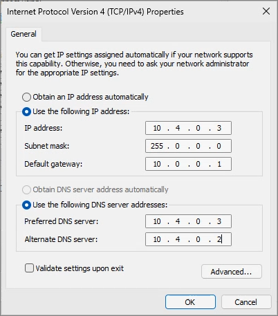 Enter the IP address according to your environment. Set the DNS to point to the IP address of the Domain Controller itself.